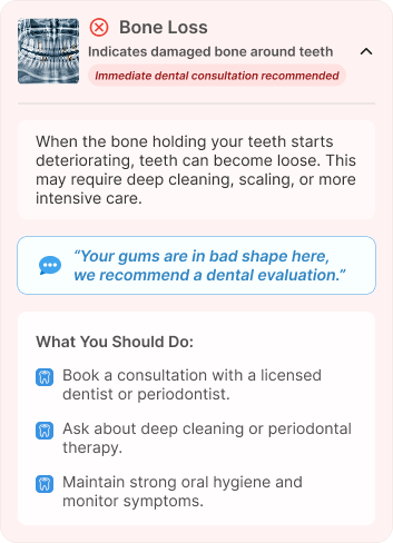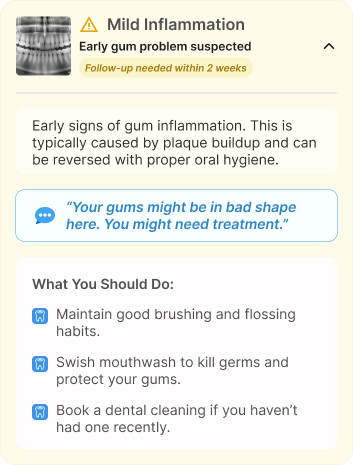 ● One subtle but powerful detail: instead of overwhelming users with medical terms up front, I added a small downward arrow beneath the visual summary. When tapped, it expands into a more detailed explanation. It’s a gentle invitation to learn more, without pressure — almost like a calm, kind dentist whispering, “Let me walk you through this.”